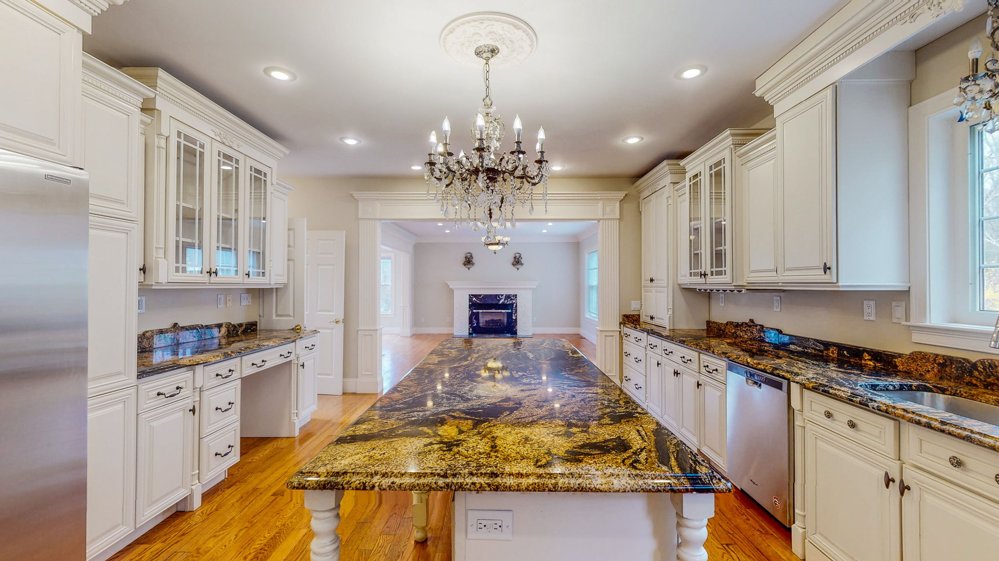 The kitchen and living room share an open layout, featuring white cabinetry, granite countertops, a large center island with turned legs, and a crystal chandelier. The formal dining room includes built-in cabinetry with arched glass doors and a pendant chandelier. Bathrooms are finished with floor-to-ceiling dark marble tile and include a soaking tub. The top-floor loft is illuminated by dual skylights and a ceiling fan. A dedicated laundry room with tile flooring and an attached garage add practicality. A spacious rear deck with wood railings overlooks a private, tree-lined backyard.